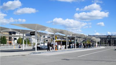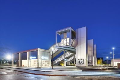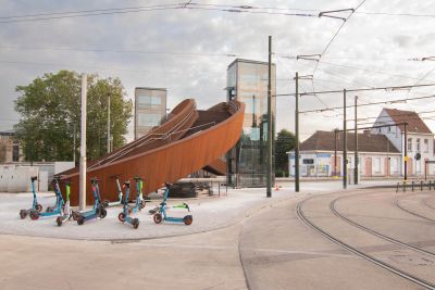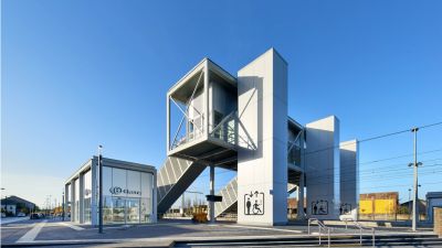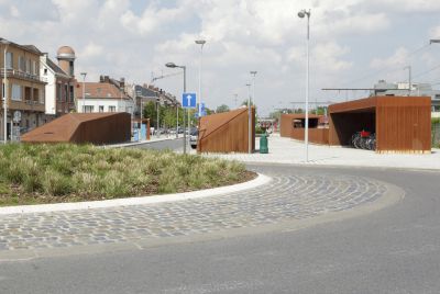 Tekst: Les ouvrages concernés relèvent de la deuxième phase des aménagements pour le RER : construction d’un parking souterrain et de ses accès; création d’un couloir sous voies desservant les quais et reliant les deux rives du chemin de fer; extension de la gare des bus et aménagement des voiries et de l’espace public. L’acier auto-patinable est le dénominateur commun à tous les édicules qui émergent sur le site et rythment l’espace public.