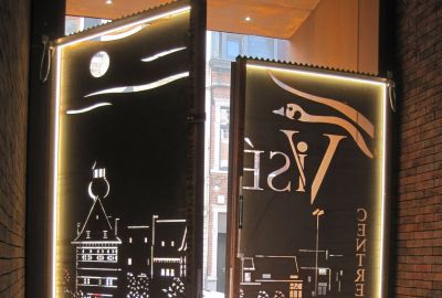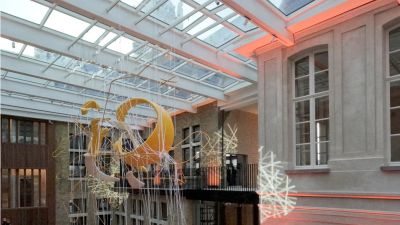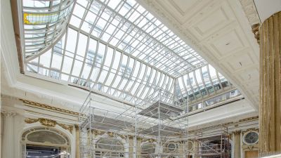 Tekst: Une menuiserie en acier de baguettes en verre rondes pour les anciennes façades de l’hôtel de ville fait également office d’élément structurel à côté du grillage. Elle est composée de profils de gaine ronds à paroi épaisse pour les barreaux et les fins profils en T soudés pour les poutrelles de la toiture. Les colonnettes rondes ont été encastrées à la base pour limiter la déformation de la façade par la charge de vent. La stabilité horizontale a été assurée par des lattes horizontales dans les façades en bout.