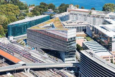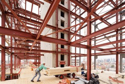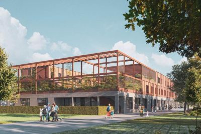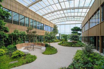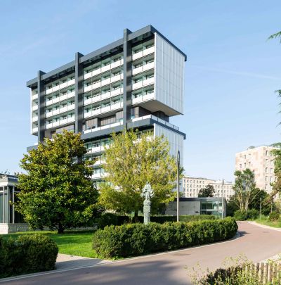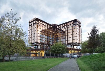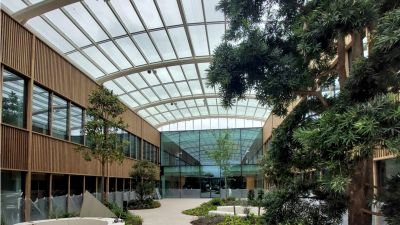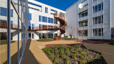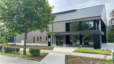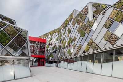 Tekst: Le nouvel Hôtel de Ville (12.500 m2) attire l’attention par ses façades : végétalisées, inclinées et non rectilignes, avec une pose de profilés mur-rideau à 45°, elles sont complétées par une passerelle rouge vif, sur deux niveaux, qui relie les deux ailes. Intérieurement, il se caractérise par l’utilisation de planchers mixtes bois-béton, portés par une charpente métallique en grande partie visible.