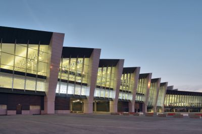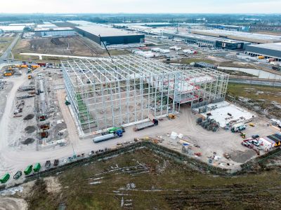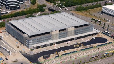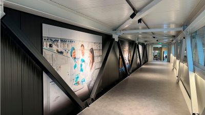 Tekst: Le Connector, un bâtiment de 200 x 50 m, relie le Pier A au Pier B et est constitué de 12 portiques de 15 x 50 m avec une pente différente, ce qui crée un arc esthétique. La structure en acier primaire (2.100 tonnes) est composée de colonnes en treillis triangulaires et de colonnes rondes standard sur lesquelles des fermes de comble sont positionnées. Les panneaux de façade sont constitués essentiellement de panneaux Karrier, de tôles AWP Curved Wall, de panneaux Evolution plats et de panneaux AWP MMR profilés de Kingspan.