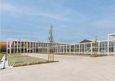 Tekst: Les deux formations, ferronnerie d’art et maréchalerie, ont été réunies, avec cette nouvelle construction, à un seul emplacement pour offrir tout le confort contemporain aux élèves. La nouvelle école comporte un programme d’environ 1525 m2 et part d’un modèle de patio pour garantir la sécurité et la maîtrise du bruit. L’enveloppe de la construction en acier est constituée d’une tôle d’acier prélaquée de couleur cuivre. Cette couleur cuivre assure une présence du bâtiment dans le quartier sans qu’il soit perçu comme trop industriel.