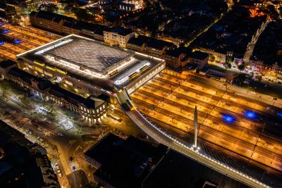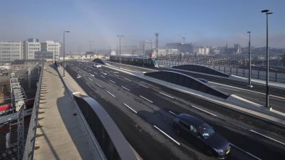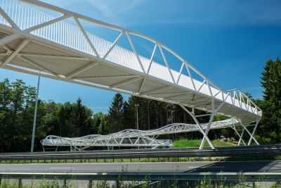 Tekst: L’ouvrage OA894 constitue un pont de franchissement majeur au-dessus de l’autoroute A1 dans le cadre du prolongement de la ligne n°1 du tramway luxembourgeois vers l’aéroport du Findel. Il s’agit d’un ouvrage mixte acier-béton, composé de deux travées hyperstatiques de 45 m et 63 m, pour une portée totale de 108 m. L’implantation répond à des exigences fortes en matière de fonctionnalité ferroviaire, de contraintes autoroutières et d’intégration dans l’environnement. Le tablier supporte deux voies de tramway ainsi que deux pistes de service, présentant une largeur utile totale de 7,27 m. L’ouvrage OA894 incarne un exemple remarquable de synergie entre ingénierie structurelle avancée et design architectural intégré. Sa charpente métallique fermée assure une robustesse optimale pour un franchissement ferroviaire en courbe, tandis que son habillage en aluminium confère à l’ensemble une légèreté visuelle et une signature contemporaine. Pensé pour durer, l’ouvrage s’inscrit avec élégance dans un environnement paysager délicat, à proximité immédiate d’une zone Natura 2000.