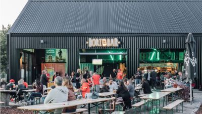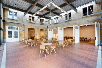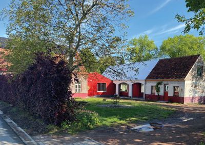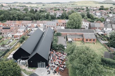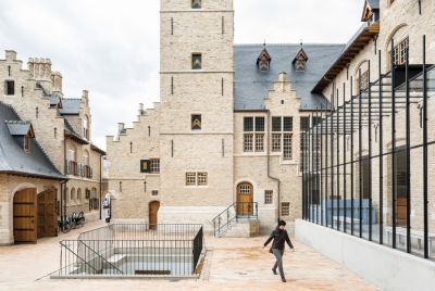 Tekst: Le maintien du caractère actuel du site était crucial pour l’implantation du nouveau programme dans ce complexe historique. L’intervention la plus radicale a été l’adaptation de la forme de la toiture et du revêtement de façade de la liaison entre le garage d’origine et l’ancienne brasserie. Pour la stabilité, des tirants de façade et des poutres en acier supplémentaires ont été placés dans les caves. Des fermes et des poutres en bois ont été renforcées de la manière la plus subtile possible avec des éclisses et des haubans en acier.