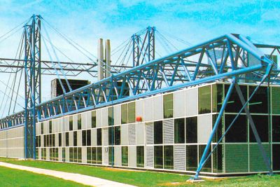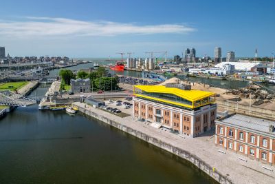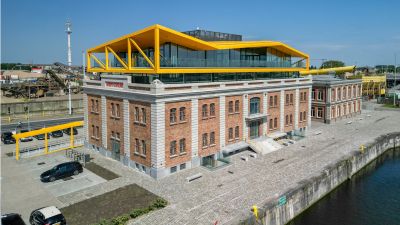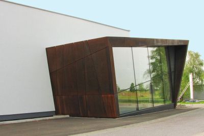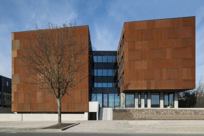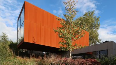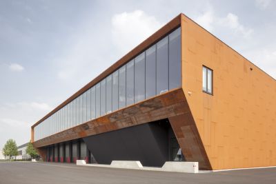 Tekst: L’option pour le matériau de la façade est un élément essentiel de ce projet. Les grands volumes de construction ont été totalement revêtus d’un platelage en acier résistant aux intempéries (« corten ») qui non seulement confère à l’ensemble un caractère industriel, mais d’où émanent également spécificité et chaleur. Outre son aspect naturel avec une couleur, une texture et différenciation prononcées, il permet de grandes économies d’énergie au niveau des frais d’exploitation. L’acier résistant aux intempéries est totalement exempt d’entretien.