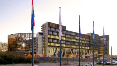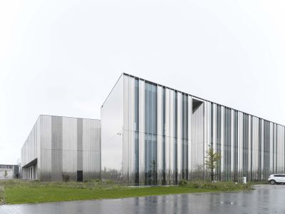 Tekst: Le notariat initial, qui répondait joliment au paysage, n’avait été mis en service que cinq ans seulement auparavant, mais une extension s’imposait déjà. Le concept raisonné de l’époque ne supporte aucune poursuite ni copie ; un angle d’incidence radicalement différent était nécessaire. Face au volume principal massif en briques, une nouvelle structure miroitante est placée. La façade extérieure miroitante est constituée de panneaux en acier inoxydable à hauteur d’étage d’une épaisseur de 1 mm seulement.