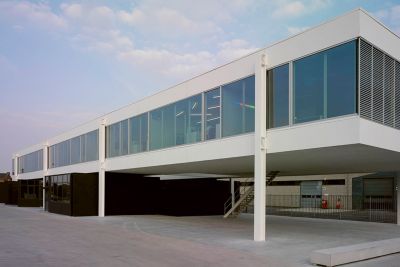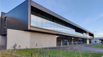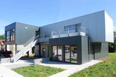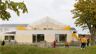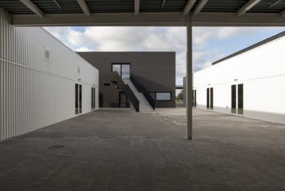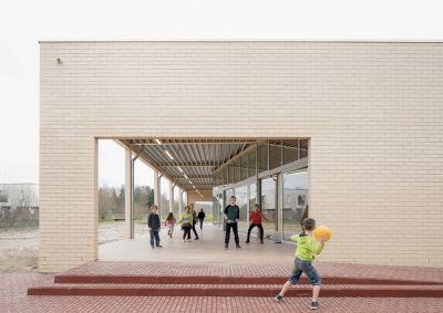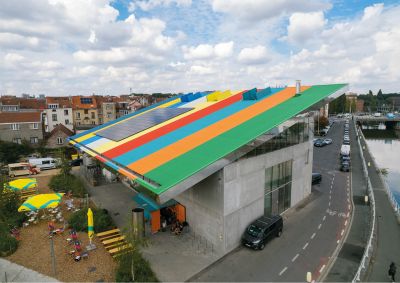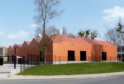 Tekst: Les ateliers de cette école primaire d’enseignement spécial ont une structure en acier revêtue d’un steel-deck (ArcelorMittal Arval Hacierba) et de plaques de façade en acier prélaqué noir (SAB 45/900 Colorcoat Prisma®) sur des boîtes intérieures (ArcelorMittal Arval Hacierba). Ce revêtement a aussi été utilisé pour le bâtiment principal. La structure portante reçoit, sur l‘intérieur, un post-traitement avec un revêtement retardateur d’incendie. Le choix en faveur d’une structure et d’une façade en acier permet, avec un budget strict, de réaliser un travail sur mesure au soulignement et aux détails raffinés.