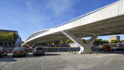 Tekst: D'apparence modeste et ingénieusement intégré dans un espace restreint. Le 'Suikerbrug' (pont sucre) à Veurne (Furnes), avec ses rampes peu raides et faciles d'accès, semble presque flotter au-dessus de la route et du canal. Vous pouvez y faire du vélo ou vous promener en toute sécurité parmi les cimes des arbres, depuis le nouveau quartier résidentiel situé sur l'ancien site de la sucrerie jusqu'à la vieille ville, en passant par l'eau. Avec une nouvelle perspective à chaque virage, la traversée devient une expérience spatiale. Le pont est constitué d'une poutre en acier élancée et d'un tablier en béton, et est soutenu par des colonnes extrêmement minces. La conception regorge de solutions innovantes, telles que les appuis pendulaires cachés dans les semelles, les virages en porte-à-faux et les poutres de fondation en porte-à-faux dues aux fondations de l'écluse. Tous les matériaux sont conformes à la norme NBN EN 10025 pour les produits plats et longs, dans un type d'acier S355 et S460. Les épaisseurs nominales des éléments en acier varient de 6 mm (plaque de recouvrement du socle) à 80 mm maximum (colonnes) et 120 mm (socle colonne en forme de V). La structure en acier a reçu une finition exceptionnellement durable. Après un sablage intensif, elle a été traitée avec une métallisation Zn-Alu pulvérisée à la flamme de 100-120 microns. Ensuite, un système de conservation à 6 couches a été appliqué.