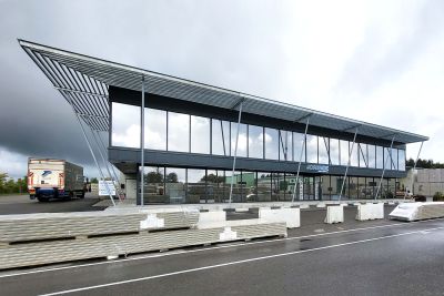 Tekst: Le nouveau poste de commande est implanté en bordure de l’écluse principale et regroupe les commandes des 4 écluses du site de Lanaye. Le bâtiment se compose de deux volumes parallélépipédiques, superposés et décalés. Le volume supérieur est complètement vitré. Grâce à sa structure métallique particulièrement minimaliste, composée de 4 tubes 150/150/5 mm supportant la toiture. Les façades et les faux-plafonds sont enveloppés de feuilles en métal déployé.