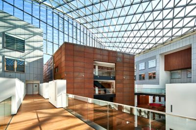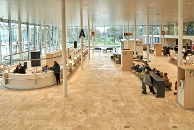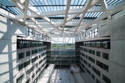 Tekst: Le nouvel hôpital est constitué de deux grandes ailes latérales en T avec un bloc arrière et un atrium central comme cœur du site. Cet atrium est constitué d’une structure de 370 tonnes de 21 x 68 m et d’une hauteur de 28 m, l’ossature pour les structures en verre de la toiture et des murs. De ce hall d’entrée, avec toiture en verre, ascenseurs panoramiques et accueil émane l’atmosphère d’un hôtel. Tous les autres bâtiments sont raccordés à ce cœur en acier.