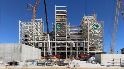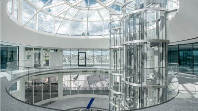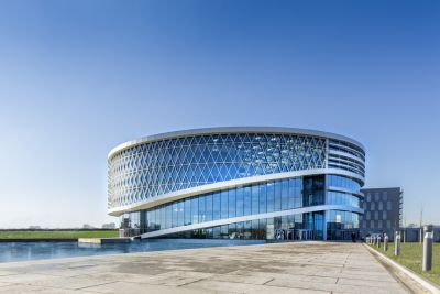 Tekst: A l’intérieur de « The Circle » s’élève, depuis le plan d’eau, une toile en acier de salles de réunion et de meetingsdecks. La toiture en verre de 1.500 m2 est portée par une structure lourde de 110 tonnes, principalement réalisée à partir de gaines en acier laminé à chaud et normalisé en S355J2H+N. Les grandes parties vitrées de la façade, supportées par un carreau en acier, présentent un espace plein d’activité. Grâce aux liaisons boulonnées dissimulées avec, d’un côté, des tôles à filet de vis taraudé, la tolérance de montage a été réduite à quasiment zéro.