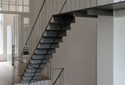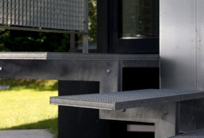 Tekst: L’escalier avec palier supérieur a été entièrement réalisé à partir d’éléments structurels en acier. Les deux limons sont composés de gaines en acier soudées (320/80/10 mm). Entre les deux limons, des gaines en acier (80/40/5) ont été soudées, sur lesquelles des tôles pliées d’une épaisseur de 5 mm ont été prévues. Les gaines et les tôles ont été soudées sur place contre les limons. Le palier supérieur est constitué de cassettes pliées d’une épaisseur de 5 mm.