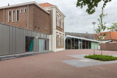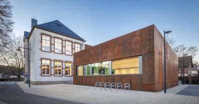Tekst: Pour contraster avec les façades enduites blanches du bâtiment protégé, la façade de la nouvelle partie a été équipée de panneaux en acier résistant aux intempéries. Sur ces derniers, un relief a été prévu avec des « bulles » qui ont été perforées à des endroits définis de manière à introduire une lumière filtrée dans la bibliothèque. Les grandes fenêtres aux angles du nouveau volume confèrent à la bibliothèque la visibilité exigée et permettent une interaction avec l’environnement.