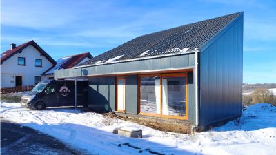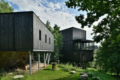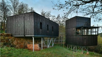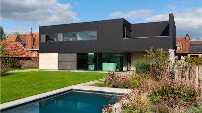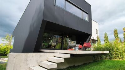 Tekst: Cette maison indépendante se trouve au bord d’un noyau résidentiel rural. Une boîte en acier noir mat est suspendue au-dessus d’une paroi en bois. Les poutres et les charpentes intégrées de la structure portante principale en acier permettent de réaliser le porte-à-faux de manière simple. Une habitation à ossature en acier peut offrir plus de surface habitable avec des vitrages plus étendus pour un même coût de construction. Un concept cohérent, imaginé à partir d’une construction en acier, peut représenter une économie allant jusqu’à 20 pour cent.