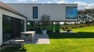 Tekst: Les constructions arrière impropres de l’habitation en série ont été remplacées par un ensemble de lumière et d’espace. Une façade arrière rigoureuse et contemporaine prépare cette habitation en série pour l’avenir. La fenêtre de la façade arrière est un clin d’œil à la distribution en T classique des fenêtres, fût-elle un peu plus grande, disons aux dimensions jumbo. Les battants ouvrants ont une largeur de 3 m et une hauteur de 6 m. La grande fenêtre garantit un sentiment intérieur/extérieur puissant entre l’espace intérieur triplex et le jardin.