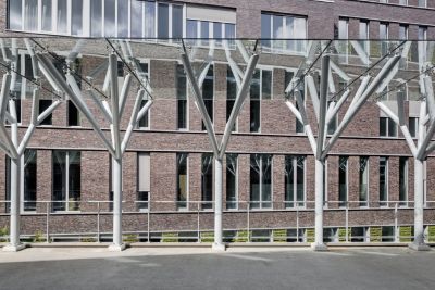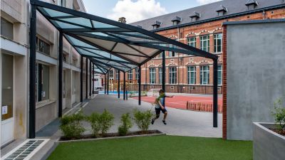 Tekst: Pour la construction de l’école de gastronomie hypermoderne (2.500 m2) Ter Groene Poorte à Bruges, on a utilisé des poutres de charpente en acier et des triangles en porte-à-faux pour les auvents, ce qui représente 60 tonnes d’acier au total. La portée des charpentes est de 27 m avec une distance intermédiaire de 6 m. Le dessous a été pourvu d’UPN 200 transversaux pour la fixation du plafond. L’auvent de la cour de récréation est en acier galvanisé (8 tonnes).