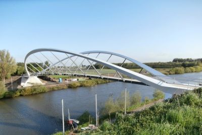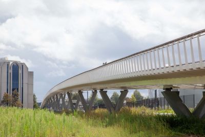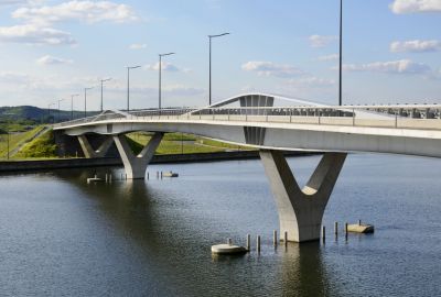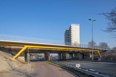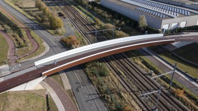 Tekst: Ce pont cyclable asymétrique avec caisson de torsion porteur et tablier en porte-à-faux attire discrètement le regard dans le paysage de polders entre Voorhout et Noordwijk auprès de Leiden (Hollande du Sud). Le pont décrit une courbe prononcée, encadrée à l'intérieur par le caisson de torsion qui s'élève au-dessus du tablier. Les points d'appui intermédiaires sont situés directement sous le caisson de torsion, à l'endroit où les efforts sont les plus importants. La conception structurelle réduit au minimum la différence de hauteur pour les cyclistes, ce qui contribue au confort d'utilisation. Les deux approches diffèrent à presque tous les égards : un remblai d'un côté et une construction dans l'eau de l'autre. C'est là que commence le pont avec une partie plate, qui offre aux cyclistes qui montent de l'espace pour prendre leur élan et à ceux qui descendent de l'espace pour surveiller la route transversale et s'arrêter si nécessaire. En raison de sa forme et de ses dimensions (73 m de long, 4 m de large), son transport a été un véritable défi. Le pont a finalement été transporté en trois parties jusqu'à son emplacement. Les différentes parties ont ensuite été assemblées à l'aide de boulons. Une attention particulière a été accordée à la conception minutieuse des trappes qui rendent les raccords accessibles tout en les dissimulant à la vue.