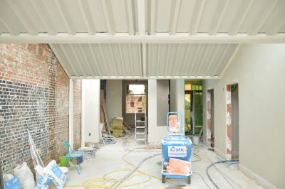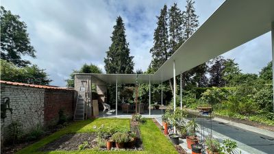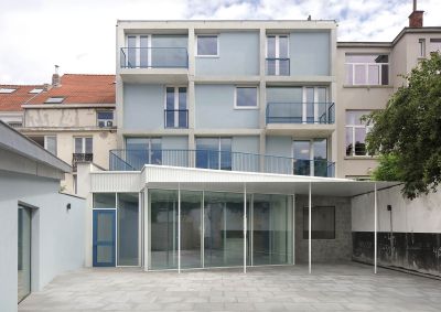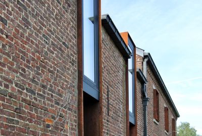 Tekst: La transformation de cette maison mitoyenne unifamiliale en un triplex et 3 chambres d’hôtes consiste en deux interventions principales : la reconstruction de la façade arrière et une rehausse partielle de la toiture. La structure des annexes est réalisée au moyen d’un jeu de poutres et colonnes en acier. Toute la peau des annexes de la façade arrière est quant à elle réalisée en tôle ondulée blanche (galvanisée et prélaquée).