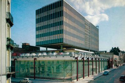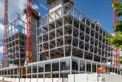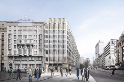 Tekst: Le bâtiment regroupe 3.300 m2 de bureaux, des salles de conférences, un restaurant et une brasserie, 2 niveaux de parking de 145 places enterrés. Le défi fut d’intégrer 7 étages de bureaux dans un gabarit urbanistique qui à priori n’en permettait que 6. Ceci ne fut possible que grâce à la charpente périphérique en acier autour du noyau central en béton. Elle est constituée de profils PRS (S355) et permet de réduire le complexe entre étage à 30 cm.