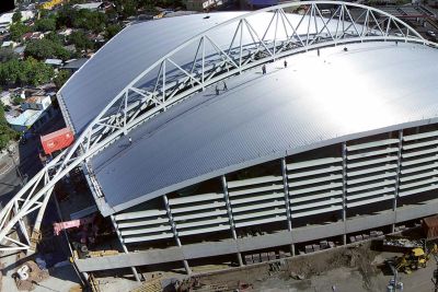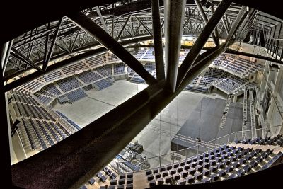 Tekst: La nouvelle construction comporte une salle de sport double d’une superficie de 4800 m² avec, au centre, les espaces de services et les tribunes. La structure de la toiture est constituée de trois voûtes en plein cintre, perpendiculaires à cette distribution. La structure particulière de la toiture confère au niveau bâtiment une identité propre qui dialogue avec la toiture voile mince de la piscine existante. La section transversale de la structure de la toiture est constituée d’une série de 3 axes à triple articulation construits à partir de profils HEB300 cintrés sur mesure.