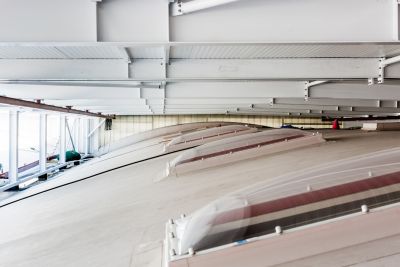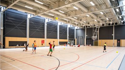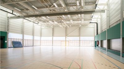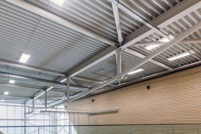 Tekst: La salle de sport et le gymnase sont en acier étiré, de même qu’une structure en auvent, divers escaliers d’accès et passerelles. L’ensemble a été conçu comme un hall étançonné dans les deux sens. Tous les 7,50 m, un portique d’une portée de 33,40 m a été placé. Pour conférer à la structure une résistance au feu R30, il a suffi d’enrober 2 tubes verticaux d’une peinture gonflante pour chaque poutre de la toiture. Le reste de la structure obtient de lui-même la résistance au feu demandée.