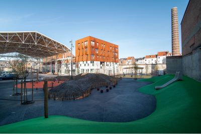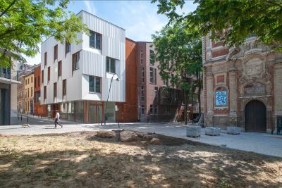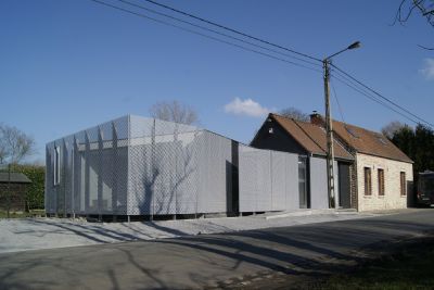 Tekst: Le projet consiste en un immeuble mixte comprenant 8 logements passifs et un espace commercial. Le commerce occupe le rez-de-chaussée et le premier étage. Le bâtiment est compact, de volume sobre et simple souligné par un pli reprenant les directions urbaines des bâtiments contigus. Les creux du bâtiment permettent aux occupants d’être en balcon sans être projetés, en insécurité ou en manque d’intimité au-dessus de l’espace public. L’acier utilisé en façade est constitué de panneaux perforés, pliés et laqués en atelier.