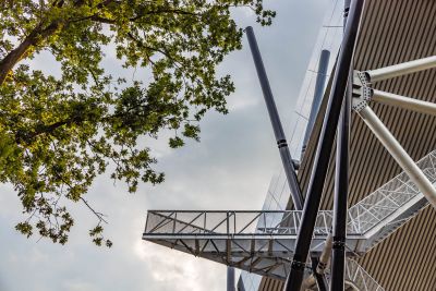 Tekst: La nouvelle structure d’ascenseur avec sa passerelle piétonne à Hesperange au Grand-Duché relie le centre du village au plateau Holleschbierg et constitue une initiative clé en faveur de la mobilité douce et l’accessibilité universelle. La tour d’ascenseur, haute de 35 m, précédée d’une place publique avec mobilier urbain, local à vélos et toilettes publiques, est construite autour d’un noyau en béton armé, complété par un escalier à plusieurs volées et quatre colonnes en acier galvanisé. Une passerelle piétonne en acier de 38 m de long, conçue comme une structure à travée unique, survol le versant boisé sans appuis intermédiaires et se raccorde aux cheminements existants menant au centre sportif. Les façades métalliques perforées de la tour et de la passerelle offrent des vues variées et confèrent à l’ensemble une forte identité architecturale. L’acier régional, la préfabrication, les assemblages entièrement vissés ainsi que la possibilité de rééquipement garantissent durabilité et pérennité de l’ensemble. L’ouvrage allie fonctionnalité et respect du paysage devenant ainsi un projet d’infrastructure emblématique.