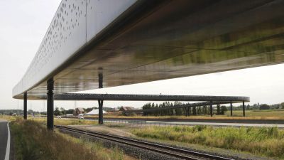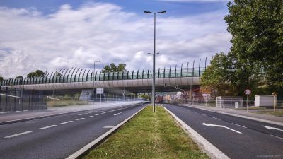 Tekst: Le pont sur l'avenue Léopold III (A201) auprès de Bruxelles est un enrichissement remarquable du paysage urbain, dont l'accessibilité, la sécurité routière, la mobilité et la qualité de vie de l'environnement sont durablement améliorées. Avec une longueur totale de 710 m - une structure en acier de 510 m et deux rampes d'accès de 100 m - ce pont est à l'heure actuelle le plus long pont pour cyclistes et piétons de Flandre. Afin d'intégrer un pont d'une telle longueur dans l'environnement bâti, son apparence a été conçue pour être aussi légère et transparente que possible et le tout a été réalisé de manière semi-intégrale. Le tablier et les balustrades ont été réalisés en acier revêtu de blanc et le pont repose sur des colonnes en acier gris en forme de V aux angles coupés. Avec sa pente progressive en une seule courbe, son tracé rectiligne et la répartition régulière des travées, le pont s'intègre harmonieusement dans son environnement. Il constitue, dans le cadre du projet 'Werken aan de Ring' (Travaux sur le Ring) de la Werkvennootschap, un maillon essentiel du réseau cyclable de la périphérie flamande.