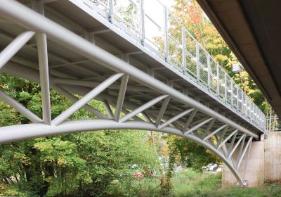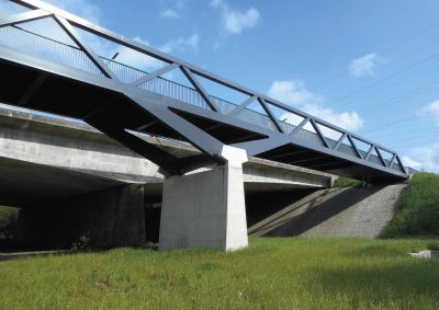 Tekst: Dans le cadre de la rénovation du pont OA318 sur la N12 enjambant l’Attert à Reichlange (Redange-sur-Attert), une nouvelle passerelle cycliste et piétonne est créée à côté de l’ouvrage existant. Cette passerelle métallique a une portée de 36,22 m. La structure portante est un treillis tridimensionnel entièrement soudé d’atelier et constitué de 3 tubes D273 longitudinaux, complétés de diagonales et traverses en tubes D139,7. Le platelage, d’une largeur de 3 m est constitué d’une poutraison longitudinale et transversale en HEA100 et de tôles d’épaisseur 8 mm, le tout entièrement soudé sur la structure portante. La structure portante tubulaire est réalisée en acier S355 tandis que le platelage est réalisé en acier S235JR. L’ensemble de l’ouvrage métallique a un poids de 24 tonnes. Un garde-corps composé de cadres tubulaires avec un remplissage en filet X-Tend, le tout en inox 316, équipe les 2 côtés du platelage. Un revêtement époxy-polyuréthane est appliqué sur l’entièreté de cette surface. La structure métallique a entièrement été assemblée et soudée en atelier, et ce, en 3 temps. La structure a été entièrement sablée, métallisée et peinte, en une pièce, en atelier, suivant le système anti-corrosion ZTV-ING 4-3 (pour une classe de corrosivité C5).