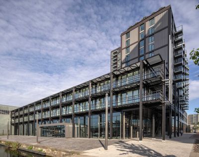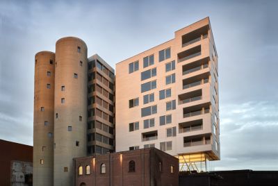 Tekst: Capawood, un ensemble d’entrepôts en briques, fait partie du complexe habitat-travail qui se dresse sur l’ancien site industriel du canal à Wijnegem. Pour la réaffectation des bâtiments, les entrepôts ont reçu comme ajout un rehaussement en acier constitué d’un système porteur extérieur de colonnes de gaines en acier soudées entre lesquelles des dalles de sol sont suspendues. La structure en acier ouverte de la construction supérieure contraste avec le caractère monolithique de la construction inférieure en briques.