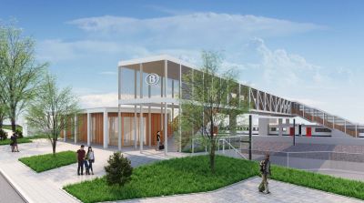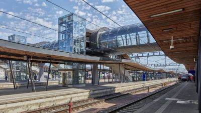 Tekst: La gare consiste en une passerelle d’une portée de 150 m traversant les voies ferrées et donnant accès aux quais par des escaliers, des escalateurs et des ascenseurs. Aux extrémités de la passerelle, un large escalier et deux escalateurs de chaque côté constituent les entrées de la gare. Par ailleurs, la gare, avec sa passerelle, relie le centre-ville à la zone commerciale de Grands Prés. De chaque côté de la gare, un parking souterrain est construit, avec un total de 860 places. La gare-passerelle comprend une galerie avec des cellules commerciales qui traverse 15 voies ferrées, 2 quais pour les bus et 2 quais pour les taxis. Il s’agit d’une structure métallique d’une longueur totale de 242 m, avec une portée maximale de 70 m entre appuis, et des auvents en porte-à-faux sur plus de 25 m aux deux extrémités. Cette charpente remplit son rôle structurel via 2 poutres treillis inclinées de 15 m de haut. La reprise des charges verticales est assurée par 12 colonnes bi-rotulées de 450 mm de diamètre, en acier plein pour certaines.