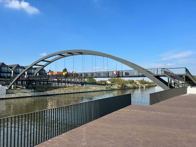 Tekst: Le pont Saspoort à Diest, inauguré en 2025, est un élégant pont cyclable et piétonnier à hauteur du site historique 'Grote Steunbeer', un barrage historique sur la Demer détournée. Il constitue une liaison sûre et confortable entre Schaffen et le centre-ville, et fait partie du réseau flamand d'autoroutes cyclables. Le pont en acier avec un tracé en forme d'arc de 100 m de long s'intègre parfaitement dans le paysage et le patrimoine et remplace un passage vieillissant. Il contribue à la mobilité durable, à la gestion des eaux et à la rénovation urbaine. Le pont est entièrement accessible, rejoint les itinéraires existants et renforce la connectivité dans la région. Le nom 'Saspoortbrug' fait référence à la porte d'accès historique située le long de l'eau et a été choisi via un sondage public.