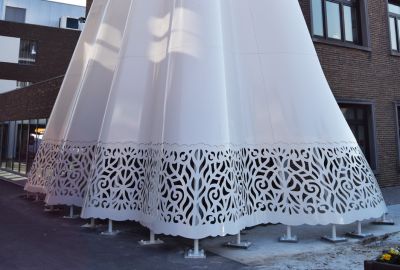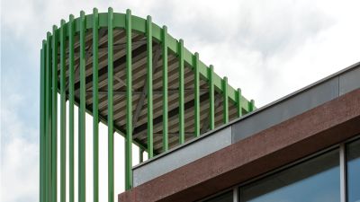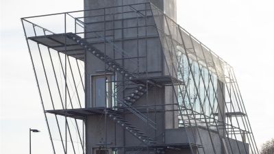 Tekst: Cet escalier de secours sous la forme d’une toile en acier est une œuvre d’art autoportante qui est constituée de tôles d’acier d’une épaisseur de 5 mm, subdivisées en 20 éléments et renforcées au niveau des rives au moyen de lattes en acier de 80 x 100 mm qui relient entre elles les différentes parties. La bande inférieure, à partir de laquelle une bordure a été découpée au laser, forme la base et est encore renforcée derrière la tôle par les profils composés et les tubes en acier. Cette base est ancrée à son tour dans la fondation au moyen de 14 pieds en acier.