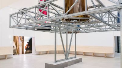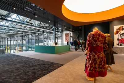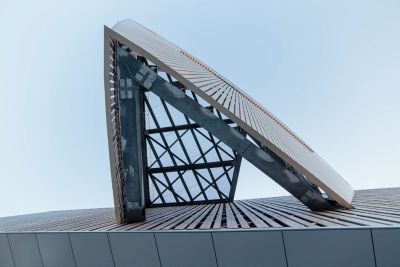 Tekst: Pour la réalisation du programme du musée, on a construit sur la toiture un hangar en acier, extension logique de la construction industrielle. La trame des colonnes en acier existantes a été poursuivie. Les poutres sont posées en diagonale les unes sur les autres à des hauteurs variables. Le revêtement à l’aide de tôles ondulées en métal couleur or est une allusion à la Golden River, la Lys, qui est connue pour la culture du lin. Un escalier en acier monumental a été intégré dans la structure portante existante.