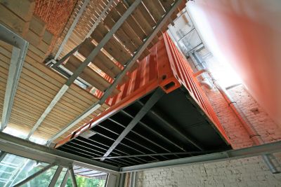 Tekst: L’application de la structure en acier dans ce projet est double : d’une part, elle assure le désenclavement des appartements au moyen de passerelles extérieures, d’autre part, elle est utilisée pour supporter la structure en acier des terrasses privées des appartements et stabiliser la façade historique. De même, les planchers, les garde-corps et les escaliers ont été exécutés dans des grilles praticables en acier. En outre, un revêtement de façade profilé métallique a été appliqué pour la majeure partie.