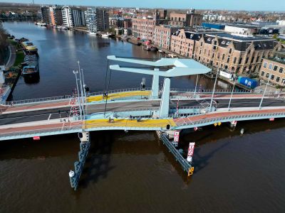 Tekst: L'ancien pont levant entre Wormer en Wormerveer au nord d'Amsterdam, a été entièrement démoli et remplacé par un nouveau pont en acier avec des approches en béton. Grâce à cette nouvelle conception, la voie navigable a été élargie de 12 à 16,5 m et la hauteur libre de passage a été portée à 2,88 m. Le pont est constitué de deux tours de 15x3 m (22 tonnes chacune), un tablier mobile de 23x10 m (95 tonnes), deux tabliers mobiles pour la circulation lente de 21x7 m (35 tonnes chacun), un balancier de 25x11 m (345 tonnes, dont 88 tonnes de ballast de réglage) et un système d'entraînement central avec des roues Panama dans le sous-sol du pont. Le tout en S355 et classe de suivi CC2. La complexité du nouveau pont réside principalement dans sa silhouette élancée. Le pont dispose de deux parties séparées pour les cyclistes et les piétons, avec à la fois un arc et une courbe en S. Les tours de levage et le balancier sont également dotés de bords et d'angles arrondis (r = 100 mm). La hauteur de construction des travées était limitée en raison du profil de l'espace libre - en dessous et au-dessus, ce qui classe le pont dans la catégorie 'très élancé'. C'est pourquoi, en raison d'un rapport de centre de gravité défavorable, il a été décidé d'utiliser un remplissage combiné en acier et en béton lourd dans le contrepoids. Composé de trois parties distinctes, chacune avec ses propres appuis, le pont compte au total huit axes alignés. La conception structurelle et électrique a également pris en compte la possibilité d'une collision : il est possible de détacher le pont cyclable (de le rééquilibrer) et de le rendre pivotant en prenant les mesures appropriées.