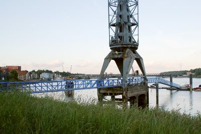 Tekst: Bourg-lès-Valence, une ville fluviale coupée du Rhône depuis la construction de l'A7 en 1965 – connue sous le nom de 'route de soleil' –, a constamment cherché à rétablir le contact avec le fleuve. La 'Passerelle Bleue', construite en 1989, n'offrait toutefois pas la liaison souhaitée à cause de sa difficile accessibilité. Le nouveau pont piétonnier vers le quartier 'l'île Girodet' a été conçu pour remédier à cela et s'inscrit dans un nouveau plan directeur. La ville a demandé un pont qui relie l'île à la ville, renforce le plan de circulation tout en tenant compte de la piste cyclable Via Rhôna, sans pour autant nuire à l'attrait et à l'expérience du parcours. Le souhait de maintenir la hauteur de la passerelle aussi basse que possible et de minimiser les pentes du côté du Quai Barjon a conduit à l'utilisation d'une structure porteuse élevée au-dessus du tablier. Même si plusieurs types de ponts peuvent convenir pour une portée d'environ 60 m, le recours à un pont à haubans ou à une structure suspendue mono-pylône permet de créer un signal visuel fort. Telle est la réponse à la demande du maître d'ouvrage. Le pont piétonnier est un pont à haubans asymétrique avec un pylône central articulé. La construction est intégrale, c'est-à-dire qu'elle est solidement reliée à la fondation. La dilatation thermique est compensée par le déplacement transversal de la construction, rendu possible par la forme prévue. Le tablier et le mât sont entièrement en acier S355, à l'exception du palier du mât, qui est en acier forgé S325G. Le tablier est constitué d'une poutre caisson rectangulaire creuse, constante sur toute la longueur de la structure, avec une plaque supérieure renforcée longitudinalement de 400 mm. La partie pylône est un tube d’acier creux de diamètre variable. Les haubans sont constitués de câbles entièrement verrouillés qui ont été protégés contre la corrosion en atelier par galvanisation, puis par un revêtement riche en zinc sur place. La passerelle piétonne devient le symbole de la reconstruction du quartier 'l'île Girodet'. Elle est également le point de repère qui invite les gens à traverser le pont.