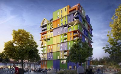 Tekst: Le projet se compose de neuf containers maritimes d’occasion formant un ensemble de quatre logements. Les containers sont superposés les uns sur les autres pour former deux niveaux. Une charpente industrielle en acier permet de supporter le tout. Les logements sont de type basse énergie et bénéficient d’un confort acoustique supérieur. Les bardages acier sont de type JI Wall 1000 FC 120mm PIR. En ce qui concerne les délais, il a fallu seulement quatre mois pour réaliser les travaux.