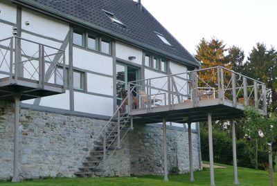 Tekst: Le projet consiste en la restauration, en deux habitations et selon le style d’époque, d’une fermette à colombages du XVIe siècle. La restauration de la partie habitée fut réalisée sur site. Une fois la partie étables démontée, le choix du matériau de structure a été l’acier, pour son coût, sa manutention, ses qualités techniques. L’acier fut également employé pour la réalisation de deux terrasses aériennes et de deux escaliers métalliques.