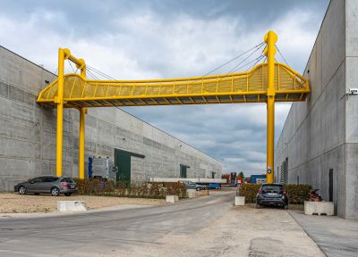 Tekst: Ce pont à Heist-op-den-Berg est une liaison fonctionnelle entre deux bâtiments industriels et s'inspire du pont Parkbrug à Anvers. Le pont jaune lui-même se compose de seulement trois éléments : deux portiques de 12 m de haut et le pont proprement dit, long de 25 m. La couleur jaune a été choisie pour se démarquer des bâtiments industriels et servir de point de repère sur le site. Des animaux artistiques sont actuellement en cours de fabrication : lion, singe, etc. Ils seront par la suite placés sur le pont à des fins décoratives.