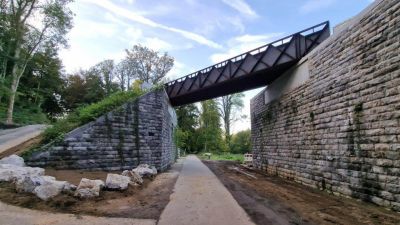 Tekst: Les 2 anciens ouvrages, franchissant la Vesdre à Nasproué et La Raye à Verviers, fortement sinistré par les inondations de 2021, sont remplacés par des nouveaux ouvrages composés de 2 poutres en caisson trapézoïdal à hauteur variable. Le tablier central est une dalle en béton coulée sur prédalles d’une largeur utile de 4 m. Ces 2 ouvrages ont été réalisés dans un marché unique de par leur analogie de conception et de dimensions. Les quartiers desservis par ces ouvrages fortement enclavés nécessitaient un timing de chantier avec coupure du passage limité. La conception de ces ponts entièrement préfabriqués a permis de limiter la période de coupure entre la pose de l’ouvrage et la mise en service à moins d’un mois et demi. La structure en acier possède une portée principale de 21 m et 26 m respectivement, sans pile intermédiaire augmentant ainsi la section hydraulique de la rivière en cas de future crue, pour un poids de 32 et 40 tonnes environ. De plus, tous les impétrants ont été intégré dans le tablier et les caissons structurels d’un part pour une meilleure intégration esthétique de l’ouvrage et d’autre part pour protéger ces réseaux en cas de future crue.