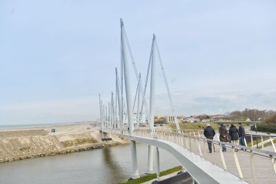 Tekst: Le nouveau pont à Gand pour cyclistes et piétons fait partie de la piste cyclable rapide F400 et de la Westerringspoorroute, qui étaient interrompues par le Watersportbaan. Localement aussi, le parcours d'aviron de 2,3 km constituait un obstacle : les quartiers résidentiels étaient à peine reliés les uns aux autres et la distance jusqu'aux équipements sportifs et récréatifs était importante. Le pont, situé à mi-chemin au-dessus de l'eau, offre la solution. Le site ne nécessitait pas un pont monumental, mais un design subtil respectant les lignes de vue. La portée de 90 m demandait une structure hybride, en partie poutre, en partie arche. La section transversale se compose de trois surfaces régulières qui varient en largeur. Il en résulte un mouvement fluide et une vue panoramique. Les panneaux latéraux fonctionnent comme des poutres Vierendeel avec des ouvertures stratégiquement placées. Le concept structurel clair crée un pont transparent et durable. La structure en acier a été conservée en bleu clair et bleu foncé (contre-ombre) et le tablier est recouvert d'un revêtement en résine avec une différence de couleur pour les cyclistes et les piétons. Le pont est monolithique, facile d'entretien et a été monté en 24 heures. Il a été nommé en l'honneur d'Annie Vande Wiele, la première femme belge ayant fait le tour du monde à la voile en solitaire.