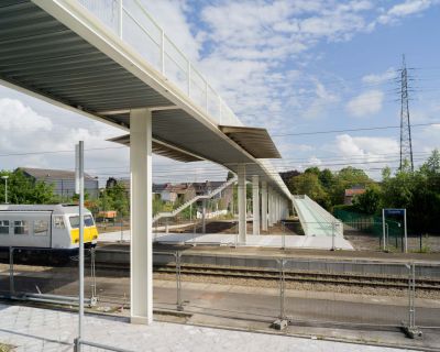 Tekst: <p>La gare de Fleurus, proche de Brussels South Charleroi Airport, a été entièrement rénovée afin de faciliter l’accès à ce dernier par transport en commun. Le chemin de fer, combiné à des navettes TEC, se voit équipé de nouvelles infrastructures mobilisant environ 170 tonnes d’acier, dont une impressionnante passerelle au-dessus des voies. Trois cages d’ascenseurs et autant d’escaliers viennent compléter le projet, ainsi que deux petits bâtiments pour les voyageurs.</p>