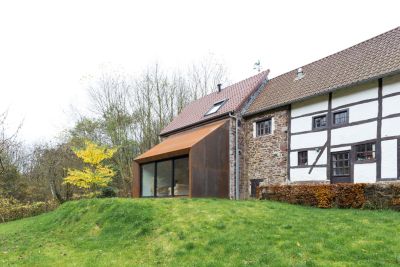 Tekst: Le projet a pour but de transformer une grange datant de 1730 en logement. L’idée est d’augmenter la surface exploitable pour y installer les pièces de vie au rez-de-chaussée (cuisine, salon et salle à manger) et les pièces de nuit à l’étage (chambre adulte, bureau et salle de bain). L’extension reçoit un bardage en tôle d’acier auto-patinable ('corten'), qui, bien que contemporain, s’inscrit dans une continuité de teinte brun-orange avec la pierre du pays.