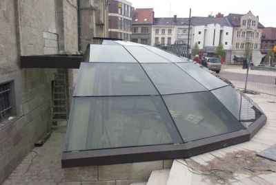 Tekst: Lors de l’extension de la crypte d’Egmont à Zottegem, une coupole en verre qui saute aux yeux a été prévue. Celle-ci a été entièrement réalisée à partir d’éléments structurels en acier. Les profils principaux sont des tés en acier soudé de hauteur variable et d’une largeur de 60 mm. Dans l’ailette verticale, des évidements ovales sont disposés. Entre les supports principaux, des tés en acier T60 ont été boulonnés de manière à ce que les surfaces en verre soient soutenues sur quatre côtés.