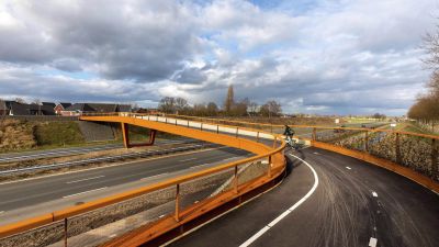 Tekst: Le pont cyclable de Helchteren au Limbourg belge, ouvert en 2023, constitue une liaison sûre et durable entre le quartier Kievitwijk et la zone PME, au-dessus de la N715. Intégré à la véloroute F74, il offre un passage confortable aux cyclistes et aux piétons. La conception du pont est aussi fonctionnelle qu'intégrée dans le paysage. Sur le côté ouest, une rampe légèrement inclinée guide les cyclistes et les piétons entre les cimes des chênes pédonculés matures. Cette intégration naturelle offre une expérience agréable de la végétation environnante. Au sommet du pont se trouve un espace de repos doté de sièges, où les usagers peuvent faire une pause et profiter de la vue sur la réserve naturelle de Molenheide. À l'est, le pont est relié à une structure métallique robuste qui s'intègre visuellement dans le contexte industriel de la zone PME. Ce virage offre également un endroit pour s'arrêter un instant et admirer le paysage. Le pont a été conçu dans un souci de multimodalité. Il est relié à des arrêts de bus rénovés, à des passages piétons sécurisés et à un réseau de pistes cyclables et de sentiers pédestres réaménagé. Il en résulte un nœud où se rejoignent différents modes de transport, contribuant ainsi à la transition vers des déplacements durables. Le pont est en outre entièrement accessible aux personnes à mobilité réduite, grâce à sa pente progressive et à ses chemins larges et dégagés.