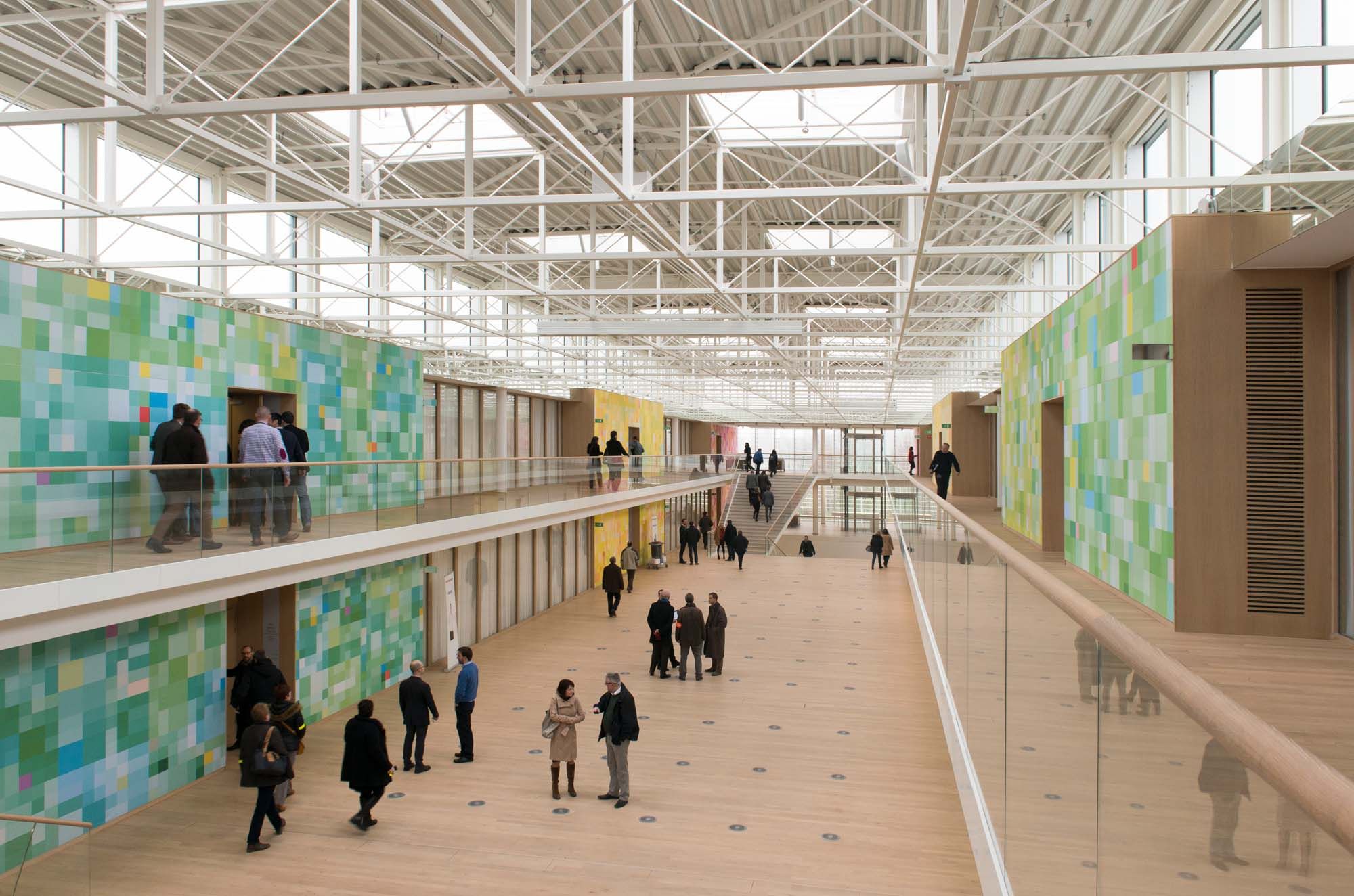 De nombreux éléments sont réalisés en acier : la structure de la couverture de la galerie en poutres tridimensionnelles supportant des bacs acier perforés pour garantir une bonne acoustique, le grand escalier du hall réalisé en 2 parties longitudinales préfabriquées et dont les appuis sont ramenés sur les colonnes des fondations par des grands poteaux obliques supportant des chapiteaux en profils reconstitués, les façades en acier inoxydable supportant les vantelles orientables, leurs mécanismes et leur caillebotis d’entretien.