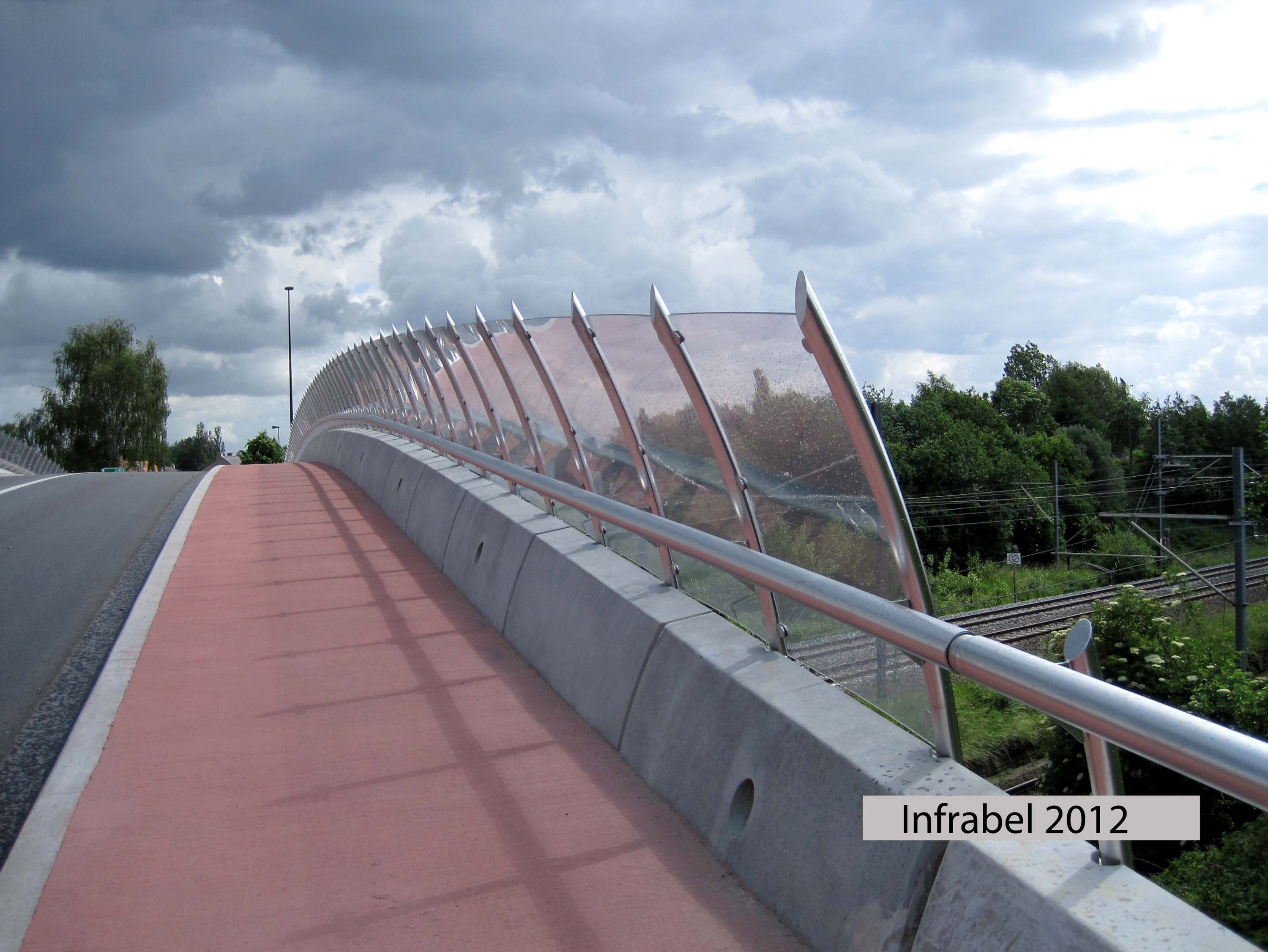 In Ternat werd onlangs de Nieuwbaanbrug, die vier sporen van de lijn Brussel – Oostende overspant, vervangen. De nieuwe brug bestaat uit voorgespannen U-betonbalken, gedragen door twee landhoofden en twee tussenpijlers. Om de minimumhoogte boven de sporen (zes meter) en de aansluiting op de bestaande wegenis te garanderen, werd gekozen voor een duidelijke boogvorm. De borstweringen hebben eveneens een gebogen vorm en bestaan uit prefabbeton met daarop een buizenleuning in elektrolytisch gepolijst RVS. Doorzichtige polycarbonaatplaten vervolledigen de boogvorm en bieden een extra afscherming zonder het zicht op het treinverkeer te beletten.