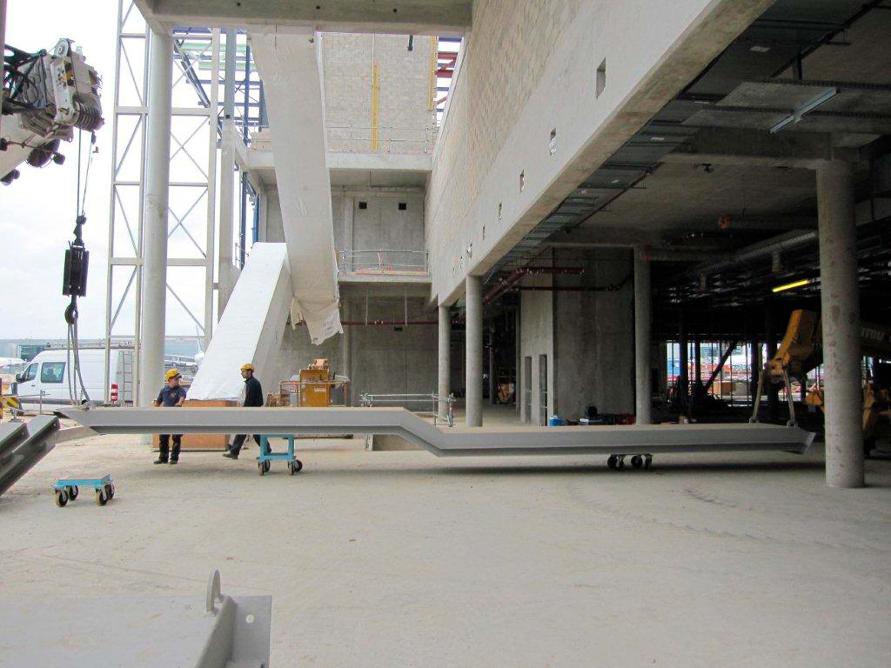 De trappen werden in één stuk in het atelier aan elkaar gelast en gemonteerd tussen de reeds geplaatste roltrappen. Op het moment van de montage was het dak reeds afgewerkt zodat er niet met een grote kraan kon gehesen worden. Er kwamen kleine hulpstructuren aan te pas en de trappen dienden ter plaatse met takels gehesen te worden.