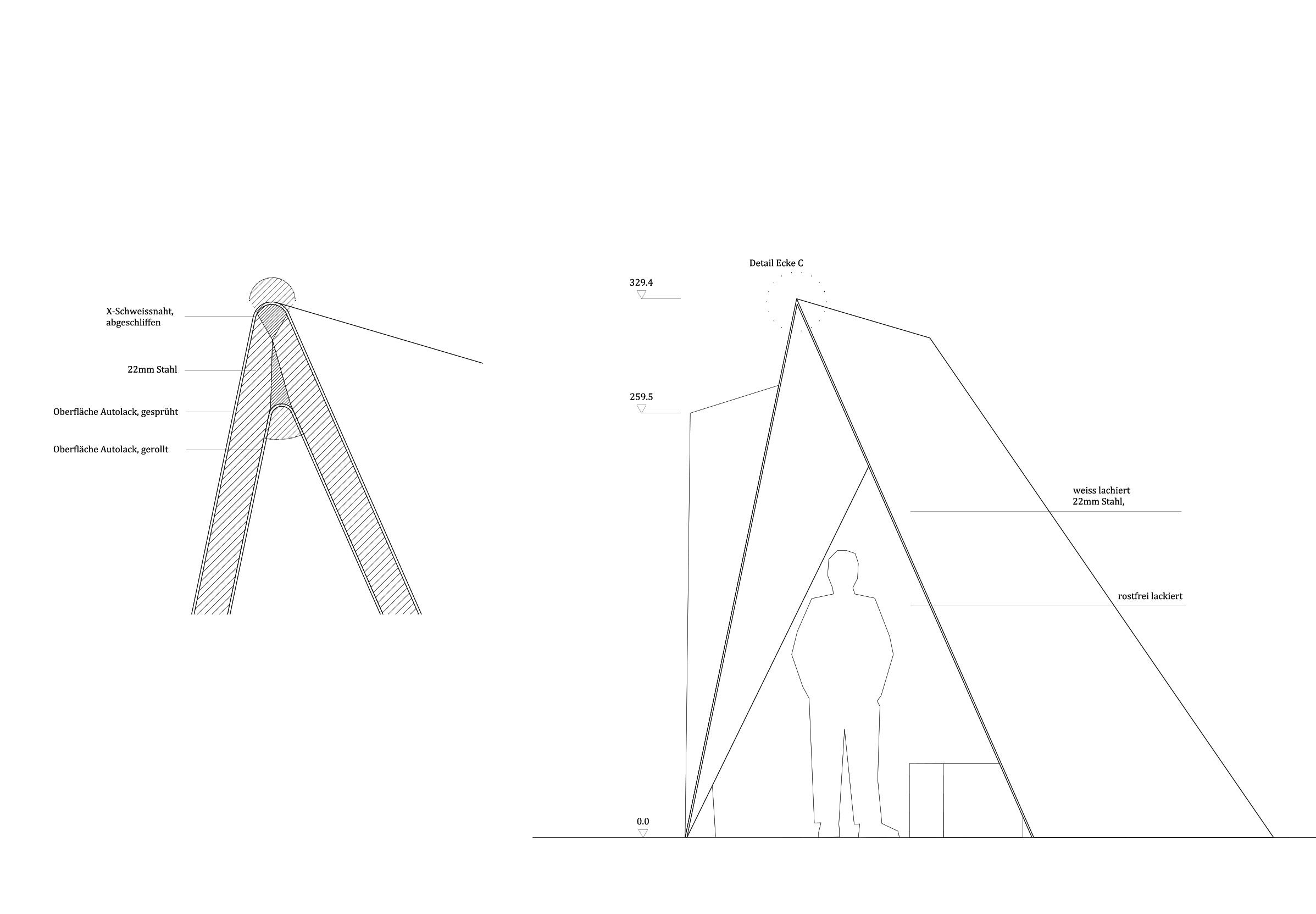 Les plaques d’acier de 22 mm d’épaisseur se présentent comme une feuille de papier pliée. La construction de 8 tonnes a été préparée en atelier et acheminée sur place par transport exceptionnel.