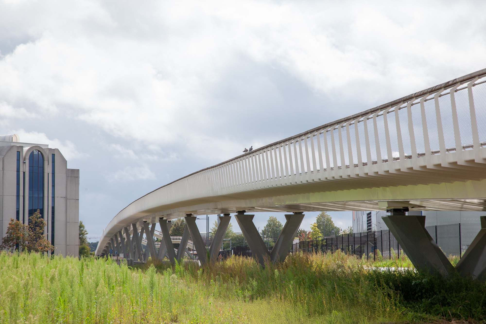Le pont sur l'avenue Léopold III (A201) auprès de Bruxelles est un enrichissement remarquable du paysage urbain, dont l'accessibilité, la sécurité routière, la mobilité et la qualité de vie de l'environnement sont durablement améliorées. Avec une longueur totale de 710 m - une structure en acier de 510 m et deux rampes d'accès de 100 m - ce pont est à l'heure actuelle le plus long pont pour cyclistes et piétons de Flandre. Afin d'intégrer un pont d'une telle longueur dans l'environnement bâti, son apparence a été conçue pour être aussi légère et transparente que possible et le tout a été réalisé de manière semi-intégrale. Le tablier et les balustrades ont été réalisés en acier revêtu de blanc et le pont repose sur des colonnes en acier gris en forme de V aux angles coupés. Avec sa pente progressive en une seule courbe, son tracé rectiligne et la répartition régulière des travées, le pont s'intègre harmonieusement dans son environnement. Il constitue, dans le cadre du projet 'Werken aan de Ring' (Travaux sur le Ring) de la Werkvennootschap, un maillon essentiel du réseau cyclable de la périphérie flamande.